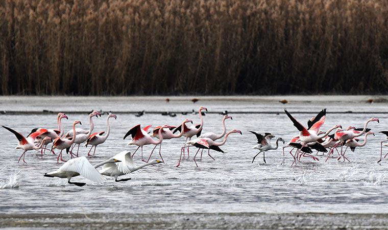 Ötücü kuğuların yanında flamingoları da görebildiklerini belirten Prof. Dr. Adızel, "Flamingoların, Kasım ayının başlangıcında geldikleri üs bölgelere veya Afrika'ya doğru gitmesi gerekiyordu. Fakat az sayıda da olsa yaklaşık 10 yıldır flamingoların bir kısmı gitmiyor; burada kalıyor. Toplam sayıları 8 ile 10 bin civarında olan flamingolardan 500'ü burayı terk etmiyor. Bunu da küresel ısınmaya bağlıyoruz" diye konuştu.