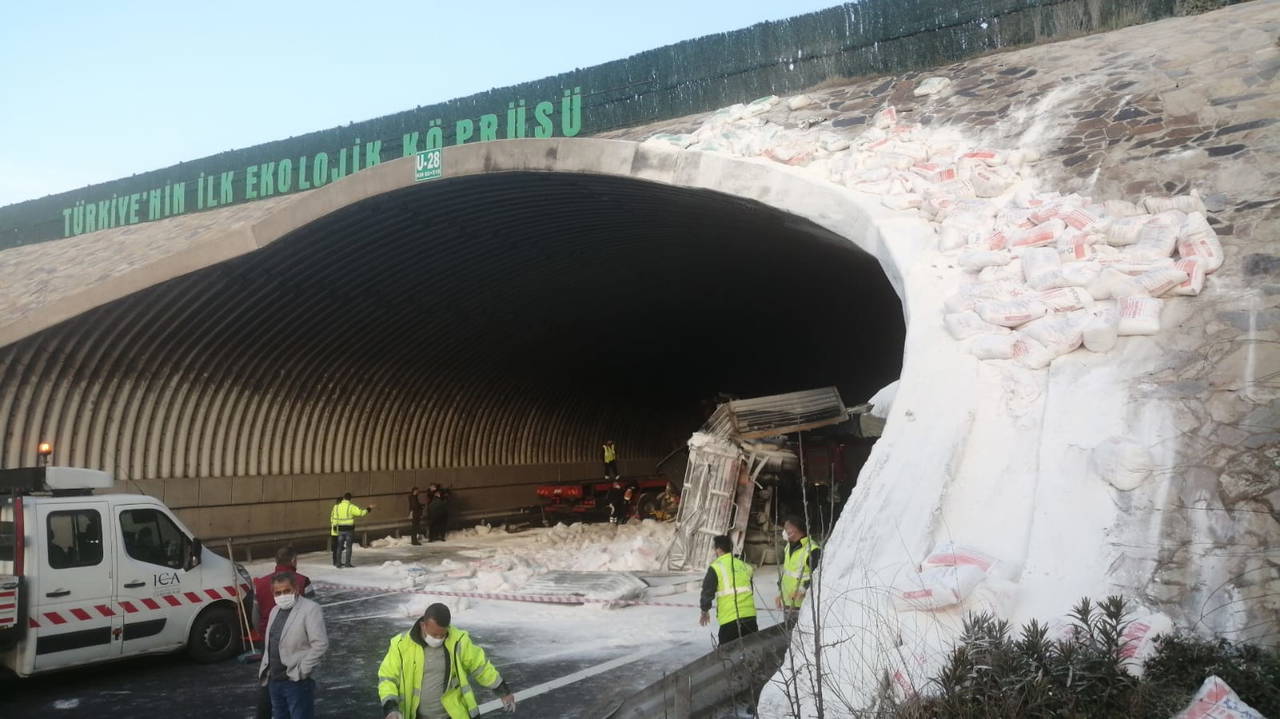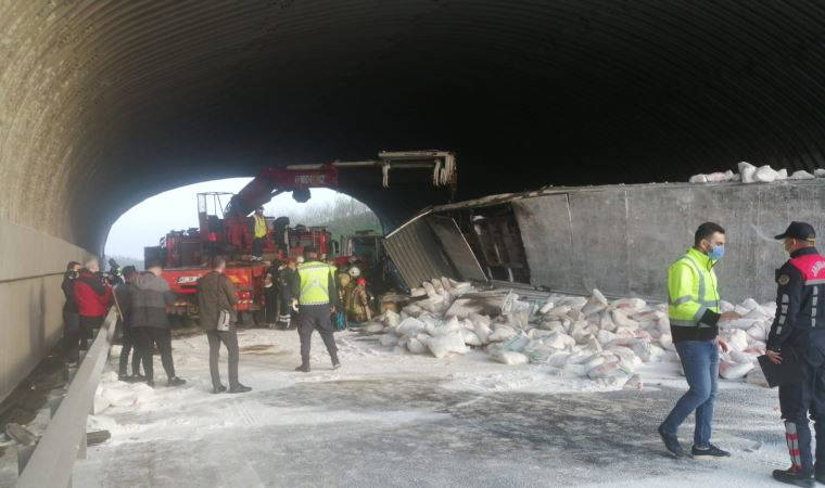 Kuzey Marmara Otoyolu'nda kireç yüklü TIR, köprünün ayağına çarparak devrildi. Kazada sürücü yaralandı.