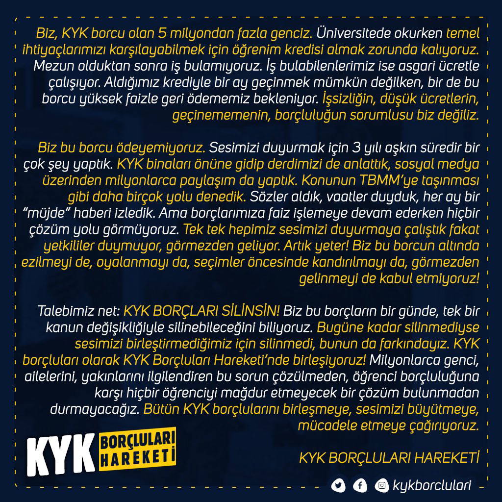 Biz bu borçların bir günde, tek bir kanun değişikliğiyle silinebileceğini biliyoruz. Bugüne kadar silinmediyse sesimizi birleştirmediğimiz için silinmedi, bunun da farkındayız. KYK borçluları olarak olarak KYK Borçluları Hareketi'nde birleşiyoruz! Milyonlarca genci, ailelerini, yakınlarını ilgilendiren bu sorun çözülmeden, öğrenci borçluluğuna karşı hiçbir öğrenciyi mağdur etmeyecek bir çözüm bulunmadan durmayacağız."