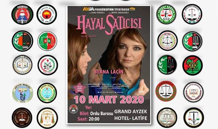 Katkı ve destek veren tüm barolarımıza, yerel ve ulusal basına, sivil toplum ve meslek örgütlerine, duyarlı halkımıza ve tesislerini bize açan işletmeye teşekkür ederiz” dedi. Berna Laçin, Ordu Barosu’nun davetlisi olarak Ordu Kültür ve Sanat Merkezi’nde sahneleyeceği “Hayal Satıcısı” adlı oyun Ordu Valiliği’nin “sahne tahsisinin teknik nedenlerle mümkün olmadığını” bildirerek iptal etmesinin ardından oyunu Ordu Grand Ayzek Oteli Latife Restaurant’ta sahneye koydu.