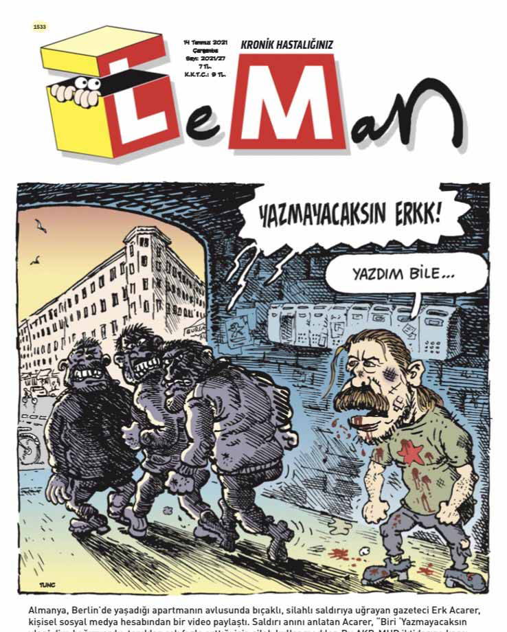 Gazeteci Erk Acarer geçtiğimiz hafta Almanya’daki evinde bıçaklı ve yumruklu saldırıya uğramış, saldırganlar Acarer'i “Yazmayacaksın” diyerek tehdit etmişti. Leman Dergisi bu haftaki kapağına Acarer’e saldırıyı taşıdı.
