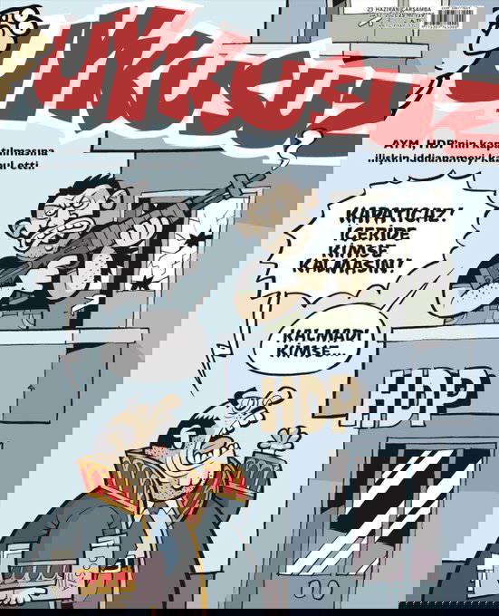 Uykusuz’un bu haftaki kapağında ise “AYM, HDP’nin kapatılmasına ilişkin iddianameyi kabul etti” ifadeleri yer aldı. Bir yargı mensubu HDP binasının önünde “Kapatıcaz, içeride kimse kalmasın!” diye bağırırken, parti binasında elinde ağır silahla bulunan saldırgan kendisine “Kimse kalmadı” diye cevaplıyor.
