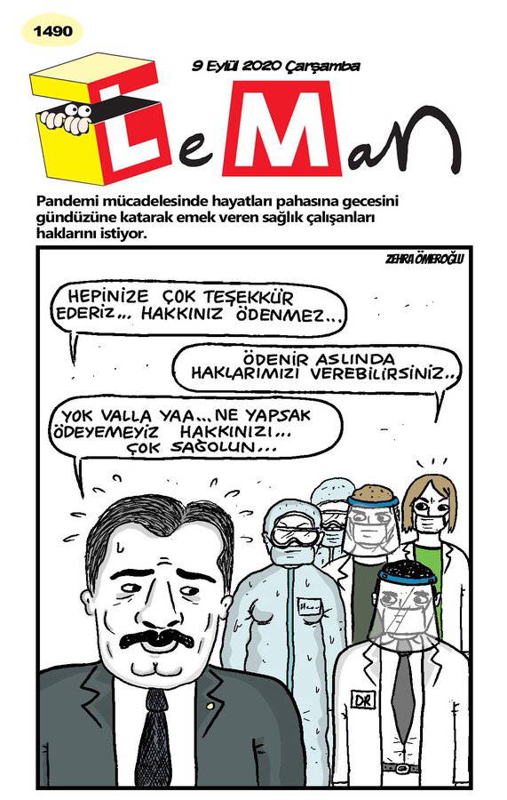 Koca'nın açıklamalarını konu alan karikatür dergisi LeMan, 14 Mart Tıp Bayramı dolayısıyla, ''Sağlık çalışanlarının yanındayız'' diyerek bir karikatür yayımladı.