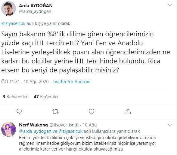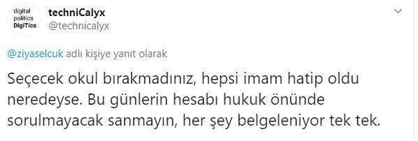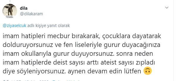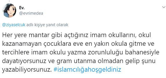 Selçuk'un söz konusu paylaşımına verilen tepkilerde öğrencilerin imam hatibe yönlendirildikleri için mecburen bu tercihi yapmak zorunda bırakıldıkları belirtildi. Bir kullanıcı, "İmam hatipleri mecbur bırakarak, çocuklara dayatarak dolduruyorsunuz ve fen liseleriyle gurur duyacağınıza imam okullarıyla gurur duyuyorsunuz. Sonra neden imam hatiplerde deist sayısı arttı, ateist sayısı zıpladı diye söyleniyorsunuz" dedi.