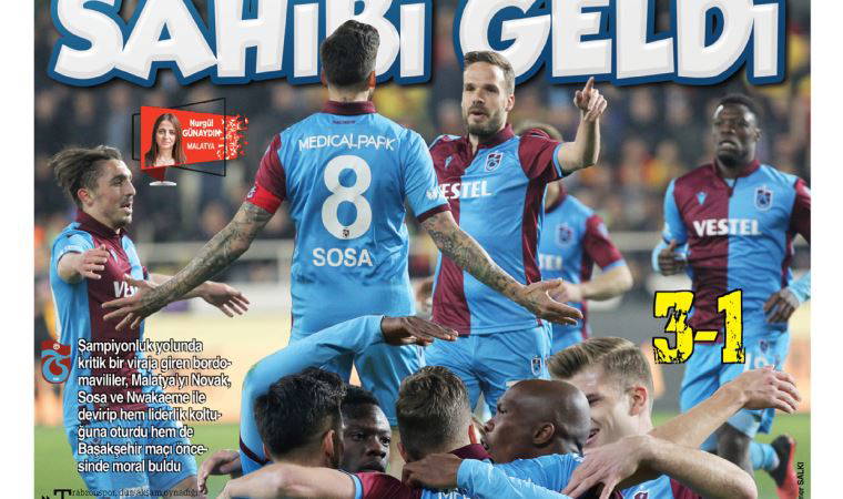 Yerel gazeteler, Trabzonspor’un 19’uncu hafta erteleme karşılaşmasında deplasmanda 3-1 mağlup ederek liderliğe yükseldiği Btc Türk Yeni Malatyaspor maçının ardından ‘Zirvenin sahibi geldi’ yorumlarını yaptı.