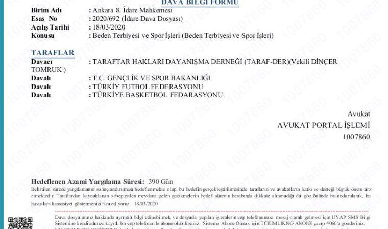 Taraftar Hakları Dayanışma Derneği, (Taraf-Der), Koronavirüs salgınına rağmen maçların devam etmesi yönündeki karara karşı dava açtı. Dilekçede, maçların oynanması kararının durdulması istendi.