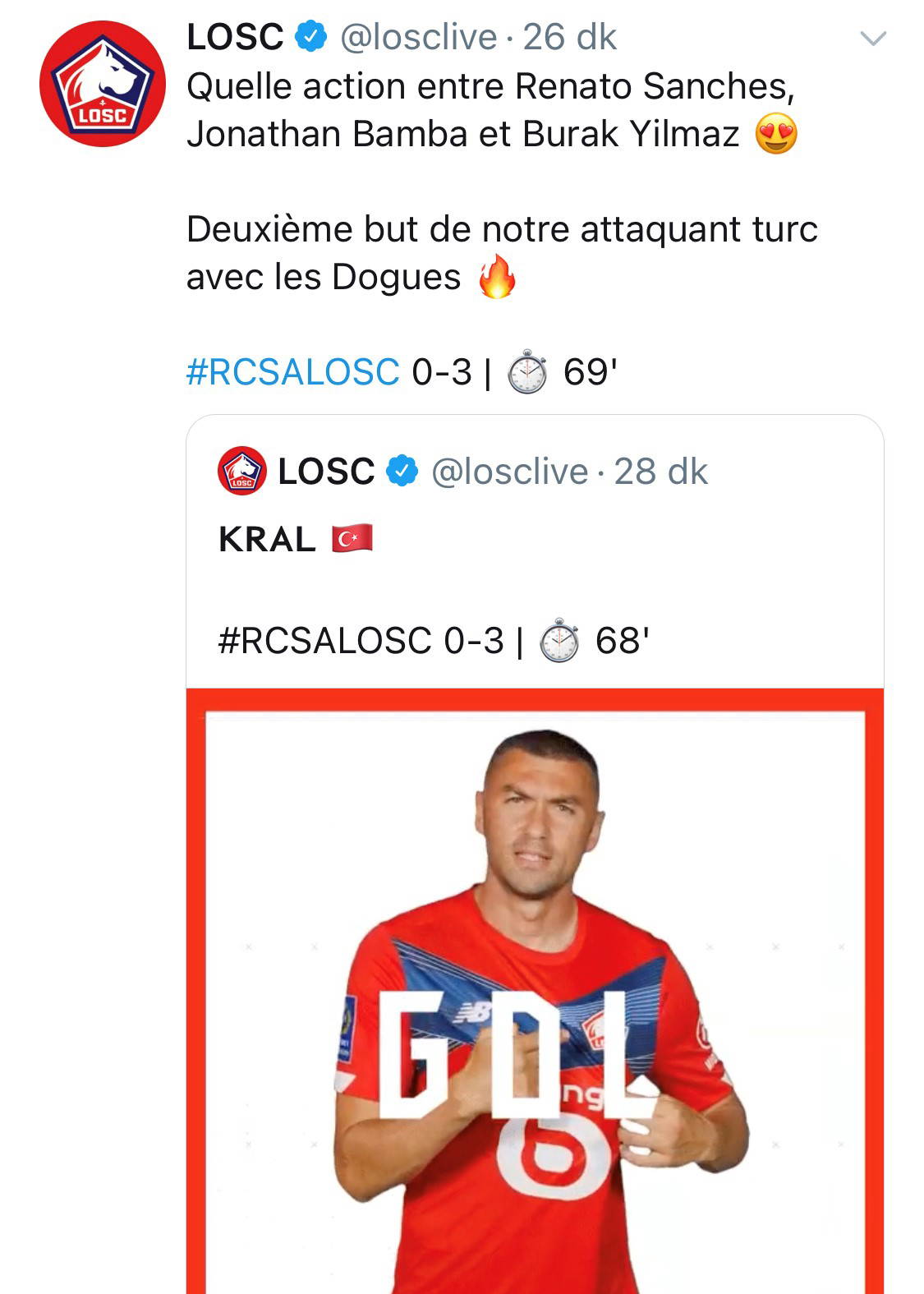 Zeki gibi ilk 11'de sahaya çıkan Burak Yılmaz'ın 68'inci dakikada kaydettiği golle fark 3'e çıktı ve mücadele Lille'in 3-0'lık galibiyeti ile sona erdi. Türkiye'den son transfer Mustafa Kapı maç kadrosunda yer almazken, Yusuf Yazıcı 74'te Xeka B. André'nin yerine oyuna dahil oldu. Lille Kulübü Burak Yılmaz'ın attığı golden sonra 'Kral' görseli paylaştı.