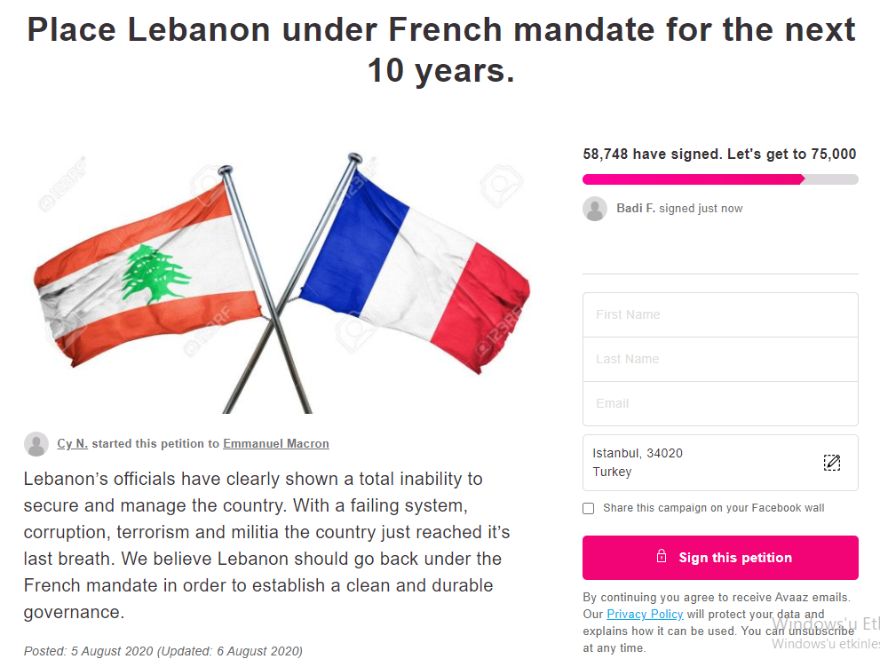 4 Ağustos’ta, Beyrut Limanı’nda yaşanan patlamanın ardından başlatılan imza kampanyasıyla beraber, bazı Lübnan vatandaşları Fransa’dan açıkça sömürge talebinde bulundu. Kampanya, 24 saatten az sürede 60 bin civarında kişi tarafından imzalandı.