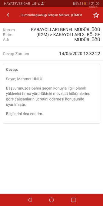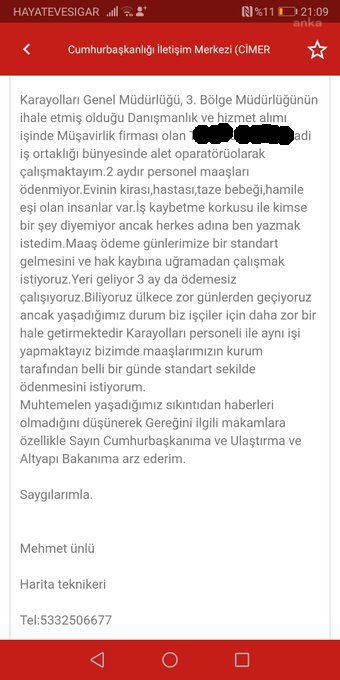 Ünlü durumu CİMER’e yazdı ve “Evinin kirası, hastası, taze bebeği, hamile eşi olan insanlar var… Yeri geliyor 3 ay ödemesiz çalışıyoruz. Biliyoruz ülke zor günlerden geçiyor ancak yaşadığımız durum biz işçiler için durumu daha zor hale getirdi. Karayolları personeli ile aynı işi yapmaktayız. Bizim de maaşlarımızın kurum tarafından belli günde standart şekilde ödenmesini istiyorum” dedi.