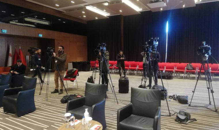 Türkiye Futbol Federasyonu’nun (TFF) UEFA ve 55 üye ülkeyle birlikte gerçekleştirdiği telekonferans toplantının ardından TFF Başkanı Nihat Özdemir, basın mensuplarına açıklama yapacak. Özdemir’in gerçekleştireceği toplantı öncesinde alınan önlemler ise dikkatlerden çakmadı. Türkiye Futbol Federasyonu çalışanları ve misafirler ile basın mensupları gün içinde ateşleri ölçülerek kontrolden geçirilirken, toplantının düzenleneceği salonda da 1 metre kuralına göre hareket edildi. Basın organlarının kameraları aralarında 1 metre mesafe olacak şekilde yerleştirilirken, TFF yöneticilerinin oturacağı koltukların aralarında mesafe bırakıldı, her masaya da dezenfektan ve kolonyalı mendil bırakıldı.
