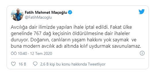 Tunceli'deki ihalenin iptal edildiğini hatırlatan Maçoğlu, "Fakat ülke genelinde 767 dağ keçisinin öldürülmesine dair ihaleler duruyor. Doğanın, canlıların yaşam hakkını yok saymak ve buna modern avcılık adı altında kılıf uydurmak savunulamaz" dedi.