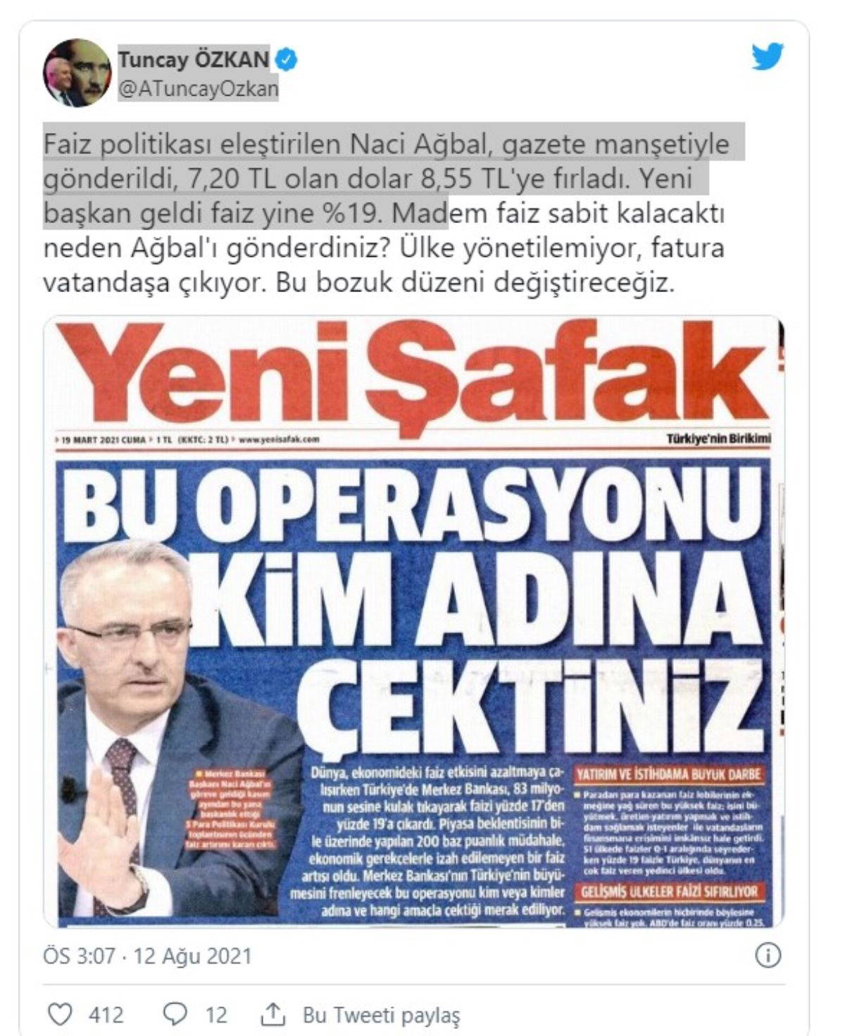 Kararı eleştiren Özkan, Yenişafak’ın “Bu operasyonu kim adına çektiniz” manşetine dikkat çekti. Özkan kişisel Twitter hesabından paylaştığı mesajında, “Faiz politikası eleştirilen Naci Ağbal, gazete manşetiyle gönderildi, 7,20 TL olan dolar 8,55 TL’ye fırladı.
