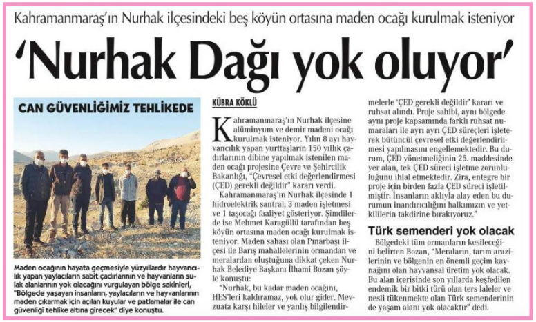 Gazetemizin gündeme getirdiği Nurhak ilçesinde yapılmak istenen alüminyum ve demir madeni projesi için Mehmet Karagüllü’nün mevzuata aykırı ruhsat aldığı haberinin ardından olumlu bir gelişme yaşandı. “Maden ocağı istemiyoruz” diyen bölge halkının ve Nurhak Belediye Başkanı İlhami Bozan’ın mücadelesi sonuç verdi. Tepkiler üzerine Mehmet Karagüllü maden ocağı için aldığı ruhsatın iptal edilmesi için Kahramanmaraş Valiliği’ne başvurdu. Valilik başvuruyu kabul ederek ruhsatı iptal etti.