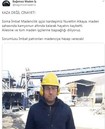 Alkaya'nın ölümü sonrası Bağımsız Maden-İş Sendikası'ndan da 'KAZA DEĞİL CİNAYET!' açıklaması yapılarak şöyle denildi: