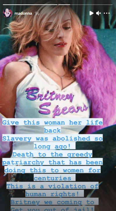 Sosyal medya hesabı Instagram'dan paylaşım yapan Madonna, Spears'ın yanında olduğunu belirterek, "Bu kadına hayatını geri verin. Kölelik çok uzun zaman önce kaldırıldı! Yüzyıllardır kadınlara bunu yapan açgözlü ataerkilliğe ölüm. Bu bir insan hakları ihlalidir! Britney seni hapisten çıkarmaya geliyoruz" ifadelerini kullandı.