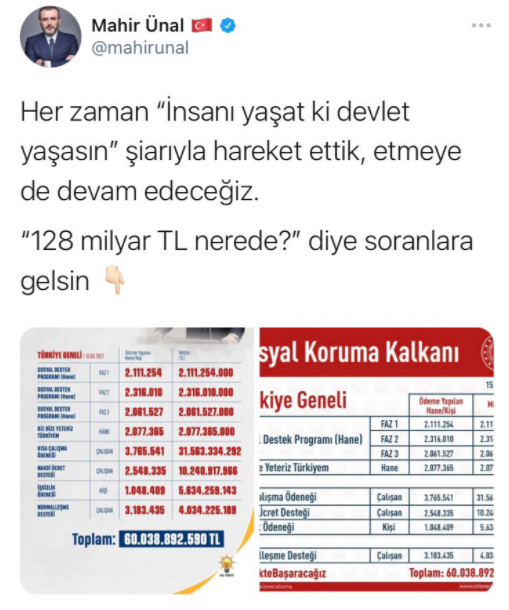 İktidarın farklı cevaplar verdiği soruya AKP Grup Başkanvekili Mahir Ünal'dan da bir açıklama geldi. "Her zaman ‘İnsanı yaşat ki devlet yaşasın’ şiarıyla hareket ettik, etmeye de devam edeceğiz. ‘128 milyar TL nerede?' diye soranlara gelsin" diyerek bir açıklama yapan Mahir Ünal, tweetindeki hata üzerine paylaşımını sildi.