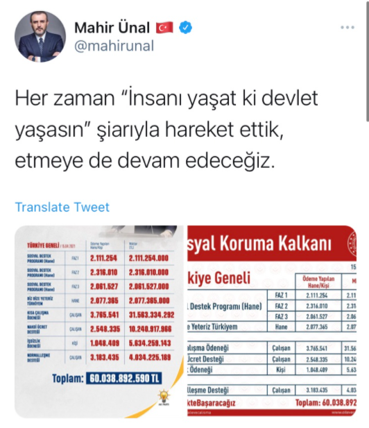 AKP Grup Başkanvekili Ünal, koronavirüs pandemisi sürecinde yapılan devlet yardımlarını gösteren bir tablo paylaştı.