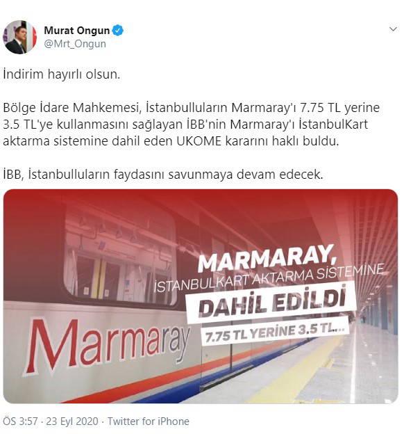 İBB Sözcüsü Murat Ongun da kararı sosyal medya hesabından paylaşarak İndirim hayırlı olsun."Bölge İdare Mahkemesi, İstanbulluların Marmaray'ı 7.75 TL yerine 3.5 TL'ye kullanmasını sağlayan İBB'nin Marmaray'ı İstanbulKart aktarma sistemine dahil eden UKOME kararını haklı buldu. İBB, İstanbulluların faydasını savunmaya devam edecek" dedi.