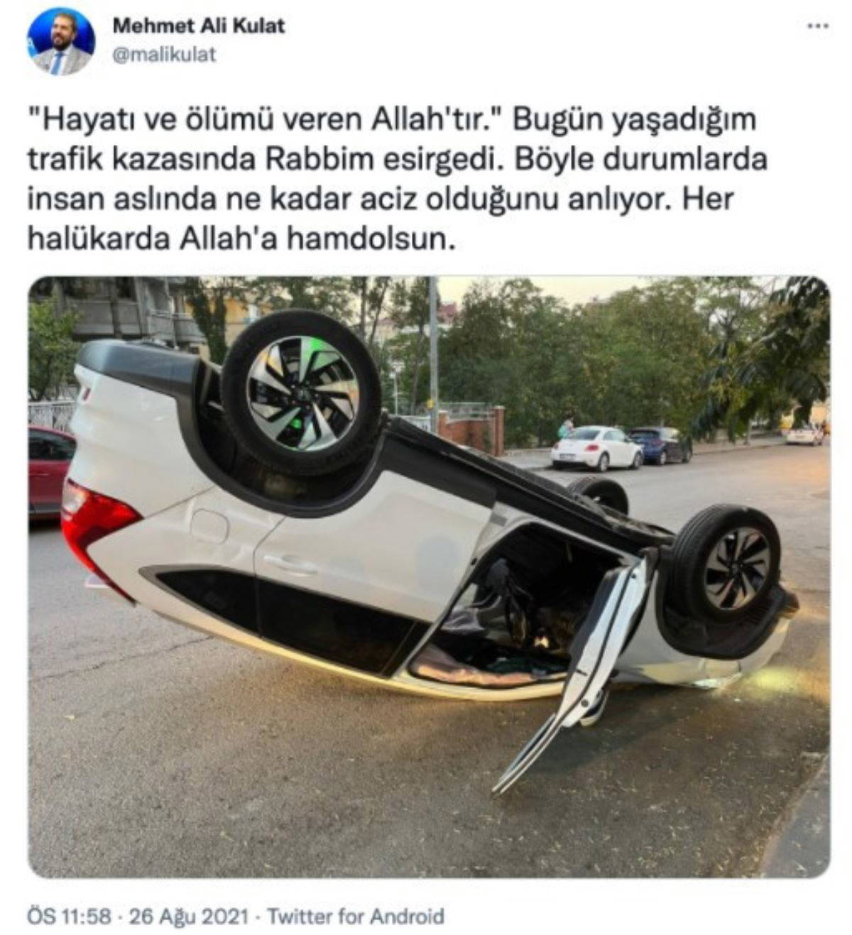 MAK Danışmanlık Yönetim Kurulu Başkanı Mehmet Ali Kulat, trafik kazası geçirdi. Takla atan araçtan çıkan Kulat, sosyal medya hesabından otomobilinin fotoğrafını çekip, "Hayatı ve ölümü veren Allah'tır. Bugün yaşadığım trafik kazasında Rabbim esirgedi" notunu düştü.