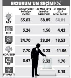 31 Mart seçimlerinde AKP’nin kalelerinden sayılan Erzurum’da 6 siyasi parti seçimlere kendi adayları ile girerken, MHP ise ittifak kapsamında AKP adayı Mehmet Sekmen’i destekliyor. 2014 seçimlerine göre kıyasla AKP’nin ekonomik gerekçelerle oy kaybı yaşayacağı belirtiliyor.