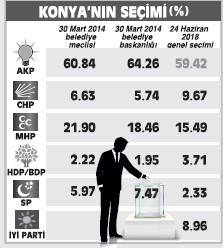 Konya’da 2014 yerel seçimlerine göre yaklaşık yüzde 30 oy kaybeden AKP’nin kaderini ekonomik sebepler nedeniyle kararsız seçmenler belirleyecek. Seçimin mevcut Belediye Başkanı AKP’li Uğur İbrahim Altay ile İYİ Parti’nin adayı Oğuz Şimşek arasında geçeceği belirtiliyor. AKP ve MHP’nin 2014 yılındaki yerel seçimlerde aldığı yüzde 82.2’lik oy oranı 24 Haziran seçimlerinde yüzde 53.60’a düştü. Mevcut belediye başkanını yeniden aday gösteren AKP’yi işsizlik ve ekonomik sıkıntılar zorlayacak gibi gözüküyor. Durumun farkında olan AKP’de daha önce kendisine oy vermiş ancak ekonomik gerekçelerle uzaklaşarak kararsız davranan seçmenini ikna etmeye çalışıyor. AKP’ye oy veren seçmenler “Suriyelilerin geçim durumu bizden iyi. Burada oy kaybının nedeni ağırlıklı olarak ekonomik sebepler olacak” diyorlar. AKP’nin aldığı oylarda Cumhurbaşkanı Tayyip Erdoğan’ın etkisinin olduğu da gözlenirken, seçmenler de “Erdoğan’a oy veriyoruz. O kimi isterse oyumuz onun” diyerek Erdoğan faktörünü doğrulayan konuşmalar yapıyor. Değişim isteyen seçmen sayısı da azımsanmayacak oranda. Konya adayları şöyle: “AKP Uğur İbrahim Altay , İYİ Parti Oğuz Şimşek, HDP Gıyasettin Almaz, Saadet Partisi Hasan Hüseyin Uyar, Demokrat Parti Ali Seçmen Çevik, Bağımsız Türkiye Partisi Hüseyin Akbal, Vatan Partisi Mevlüt Seyranlıoğlu, Bağımsız aday Mustafa Vural”