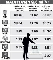 Malatya’da geçmiş dönemdeki oy oranlarına bakıldığı zaman üç adaylı bir yarış öne çıkıyor. AKP halen Battalgazi Belediye Başkanlığını yürüten Selahattin Gürkan, CHP ilin tanınmış avukatlarından Soner Gökçe, Saadet Partisi ise bir süredir il başkanlığı görevini yürüten Osman Marasalı ile seçim yarışını zafere dönüştürmeye çalışıyor. Malatya’da seçmen projelerden ziyade en önemli sorun haline gelen işsizliğe çare arıyor, bunun için yenilik ve dönüşüm söylemlerine daha fazla ilgi gösteriyor.