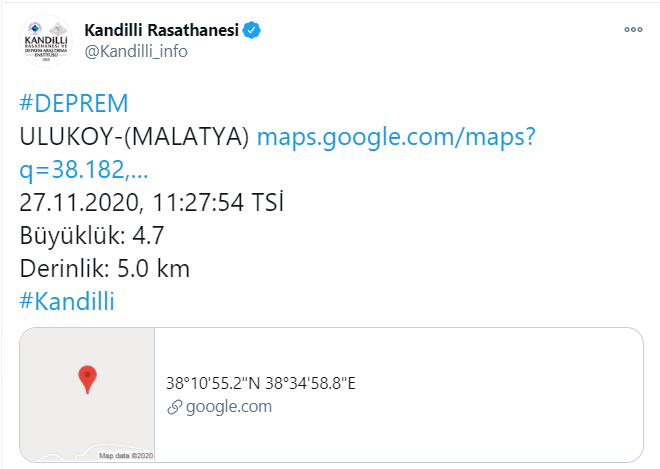 Kandilli Rasathanesi de depremin büyüklüğünü 4.7 olarak duyurdu. Boğaziçi Üniversitesi Kandilli Rasathanesi ve Deprem Araştırma Enstitüsü depremin merkez üssünü ise Battalgazi ilçesi Uluköy Mahallesi olarak açıkladı.