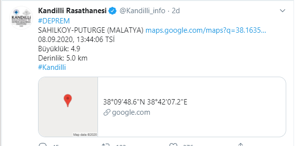 Kandilli Rasathanesi ve Deprem Araştırma Enstitüsü, Malatya'da 2 km derinlikte 4.9 büyüklüğünde bir deprem meydana geldiğini açıkladı. AFAD'ın verilerine göre ise Malatya'da 4.6 büyüklüğünde olduğu bilgisini paylaştı. Aynı bölgede saat 15.39'da 4,2 büyüklüğünde bir deprem daha meydana geldi.