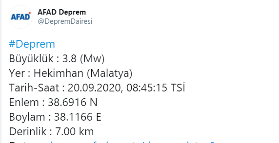 AFAD'dan alınan son dakika bilgisine göre 3.8 büyüklüğündeki depremin merkez üssü Malatya'nın Hekimhan ilçesi olarak belirlendi. Depremin 7 kilometre derinlikte gerçekleştiği öğrenildi.