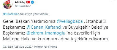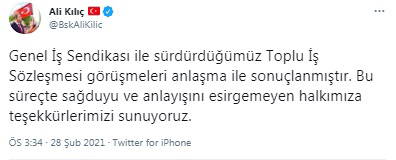 Kılıç, sosyal medya hesabından "Genel İş Sendikası ile sürdürdüğümüz Toplu İş Sözleşmesi görüşmeleri anlaşma ile sonuçlanmıştır. Bu süreçte sağduyu ve anlayışını esirgemeyen halkımıza teşekkürlerimizi sunuyoruz. Genel Başkan Yardımcımız Veli Ağbaba, İstanbul İl Başkanımız Canan Kaftancıoğlu ve Büyükşehir Belediye Başkanımız Ekrem İmamoglu'na özverileri için Maltepe Halkı ve kurumum adına teşekkür ediyorum" açıklaması yaptı.