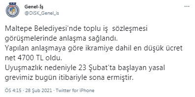 Belediyede işçiler adına görüşmeleri sürdüren DİSK'e bağlı Genel-İş Sendikası da anlaşmayı sendikanın Twitter hesabı üzerinden duyurdu. Duyuruda "Yapılan anlaşmaya göre ikramiye dahil en düşük ücret net 4700 TL oldu. Uyuşmazlık nedeniyle 23 Şubat'ta başlayan yasal grevimiz bugün itibariyle sona ermiştir" denildi.