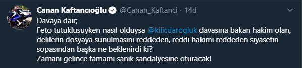 "Davaya dair; FETÖ tutuklusuyken nasıl olduysa Kılıçdaroğlu davasına bakan hakim olan, delilerin dosyaya sunulmasını reddeden, reddi hakimi reddeden siyasetin sopasından başka ne beklenirdi ki? Zamanı gelince tamamı sanık sandalyesine oturacak!"