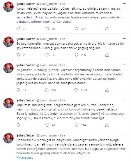 "Yangın felaketine maruz kalan bölge halkımız, şu günlerde canını, malını, sevdiklerini, evini, hayvanını, yaşam alanlarını kurtarma mücadelesi vermektedir." diyen Başkan Sözen, "bu zorlu süreçten faydalanmak isteyen provokatörlerin olduğunun da görüldüğünü" belirterek şu ifadeleri kullandı: