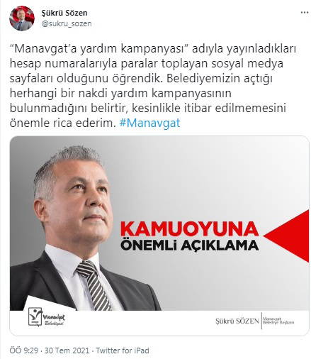 Sözen, Twitter üzerinden yaptığı açıklamada "Manavgat’a yardım kampanyası" adıyla yayınladıkları hesap numaralarıyla paralar toplayan sosyal medya sayfaları olduğunu öğrendiklerini belirtip "Belediyemizin açtığı herhangi bir nakdi yardım kampanyasının bulunmadığını belirtir, kesinlikle itibar edilmemesini önemle rica ederim" ifadelerini kullandı.