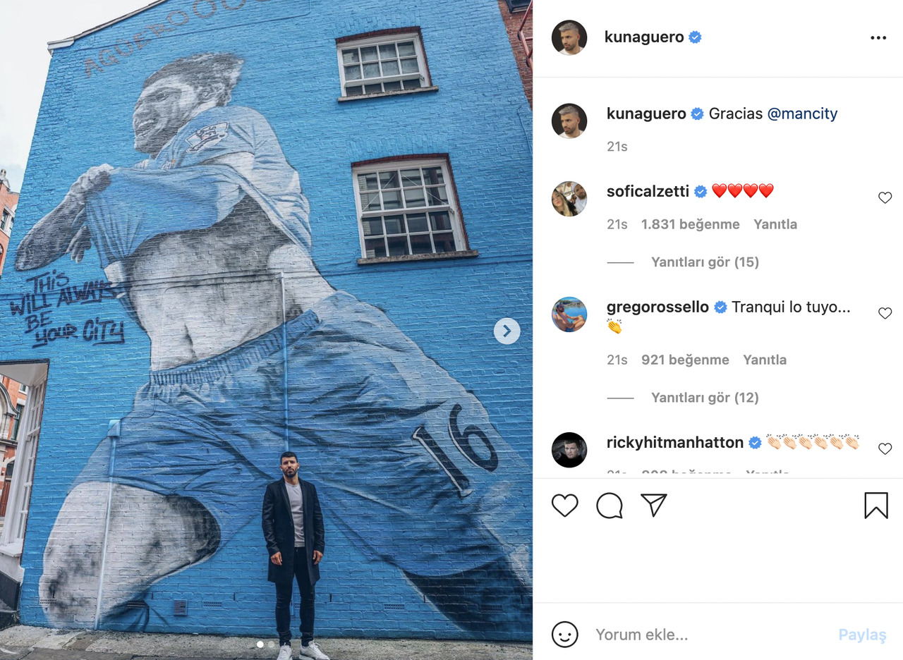 İngiltere Premier Ligi'nde bu sezonun şampiyonu olan Manchester City'de taraftarlar, Barcelona'ya transferi gündemde olan yıldız futbolcu Sergio Agüero'ya veda amacıyla dev bir duvar resmi çizdi. Agüero'nun gol sevincinin çizildiği resimde, "Burası her zaman senin şehrin olacak" mesajına yer verildi. Yıldız futbolcu için ayrıca bir mozaik tablo da yapıldı.