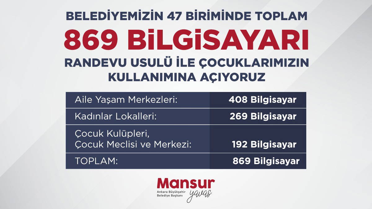 Ankara Büyükşehir Belediye Başkanı Mansur Yavaş, Ankara Büyükşehir Belediyesi’nin 47 biriminde toplam 869 bilgisayarı randevu usulü ile çocukların kullanıma açtıklarını duyurdu.