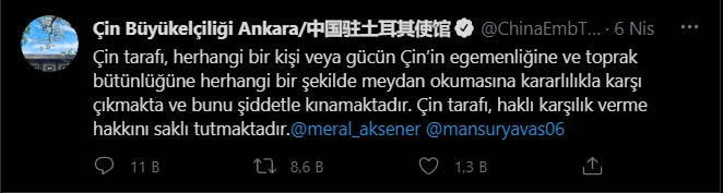 Çin Ankara Büyükelçiliği, İYİ Parti Genel Başkanı Akşener ve Mansur Yavaş'ın Uygur Türkleri'ni anmak için yaptıkları paylaşımlardan sonra sosyal medya hesabından açıklamada bulunmuştu. Açıklamada, Akşener ve Yavaş'ın sosyal medya hesapları etiketlenerek, "Xinjiang Uygur Özerk Bölgesi, Çin toprağının ayrılmaz bir parçasıdır. Bu dünyaca kabul edilen ve tartışılamaz bir gerçektir. Çin tarafı, herhangi bir kişi veya gücün Çin'in egemenliğine ve toprak bütünlüğüne herhangi bir şekilde meydan okumasına kararlılıkla karşı çıkmakta ve bunu şiddetle kınamaktadır. Çin tarafı, haklı karşılık verme hakkını saklı tutmaktadır" ifadeleri kullanılmıştı.