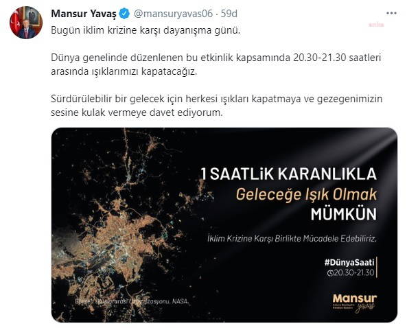 "Bugün iklim krizine karşı dayanışma günü. Dünya genelinde düzenlenen bu etkinlik kapsamında 20.30-21.30 saatleri arasında ışıklarımızı kapatacağız. Sürdürülebilir bir gelecek için herkesi ışıkları kapatmaya ve gezegenimizin sesine kulak vermeye davet ediyorum."