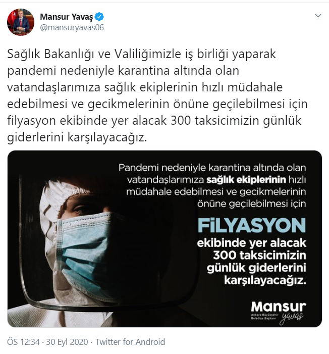 Haberi sosyal medya hesabından duyuran Yavaş, "Sağlık Bakanlığı ve Valiliğimizle işbirliği yaparak pandemi nedeniyle karantina altında olan vatandaşlarımıza sağlık ekiplerinin hızlı müdahale edebilmesi ve gecikmelerinin önüne geçilebilmesi için filyasyon ekibinde yer alacak 300 taksicimizin günlük giderlerini karşılayacağız" ifadelerini kullandı.