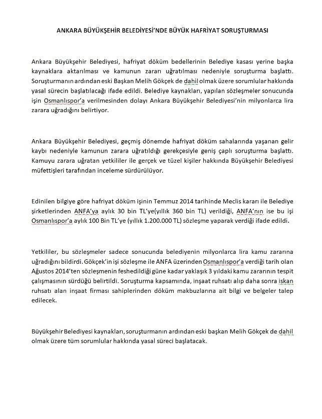 Ankara Büyükşehir Belediyesi, hafriyat bedellerinin belediye yerine başka yerlere aktarılarak kamunun zarara uğratıldığı iddiasıyla ilgili soruşturma başlattı. Belediye kaynakları, yapılan sözleşmeler sonucunda hafriyat işinin Osmanlıspor’a verilmesinden dolayı Ankara Büyükşehir Belediyesi’nin milyonlarca lira zarara uğradığını belirtti. Belediye kaynakları soruşturmanın ardından eski başkan Melih Gökçek de dahil olmak üzere tüm sorumlular hakkında yasal süreci başlatılacağını duyurdu.