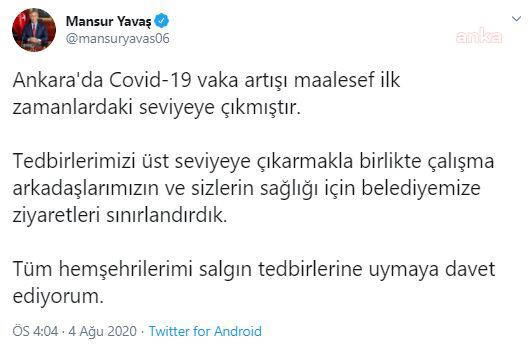 Yavaş, yaptığı açıklamada belediyeye ziyaretlerin tedbir olarak sınırlandırıldığını şu ifadelerle duyurdu: