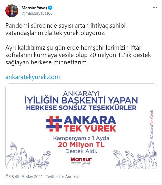 Sosyal medya hesabından paylaşım yapan Yavaş, ''Pandemi sürecinde sayısı artan ihtiyaç sahibi vatandaşlarımızla tek yürek oluyoruz. Ayrı kaldığımız şu günlerde hemşehrilerimizin iftar sofralarını kurmaya vesile olup 20 milyon TL’lik destek sağlayan herkese minnettarım'' ifadelerini kullandı.