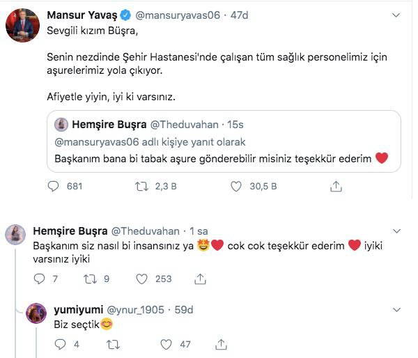 Ankara Şehir Hastanesi'nde görevli Büşra Hemşire, Mansur Yavaş'tan bir tabak aşure istedi. Büşra Hemşire, Yavaş'ın paylaşımının altına, "Başkanım bana bi tabak aşure gönderebilir misiniz teşekkür ederim" dedi.