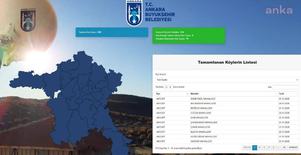 19 Kasım’da sosyal medya hesapları üzerinden yaptığı paylaşımla köylere 45 günde internet bağlantısı gerçekleştirecekleri sözünü veren Başkan Yavaş, bu sözünü bir ay içinde yerine getirdi. 10 köyde altyapı bulunması nedeniyle muhtarların kurulum istemediği, 4 köyde ise köy konağı yapımının sürmesi nedeniyle kurulumun ertelendiği ücretsiz internet hizmeti, toplam 914 köyde tamamlandı.