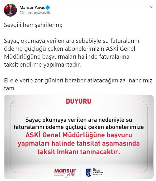 Faturlarını ödeme güçlüğü çeken Ankaralıların borçlarını taksitelendirmeleri için ASKİ Genel Müdürlüğü'ne başvurmalarını söyelen Yavaş, "El ele verip zor günleri beraber atlatacağımıza inancımız tam" dedi.