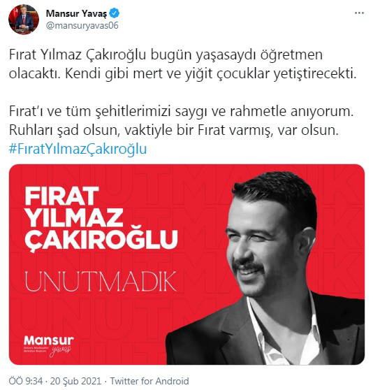 "Fırat’ı ve tüm şehitlerimizi saygı ve rahmetle anıyorum" diyen Mansur Yavaş'ın paylaşımı şöyle: