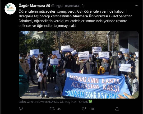 “Sevgili arkadaşlar, biraz önce aldığımız haber ve kesinleştirdiğimiz durum Marmara Üniversitesi Güzel Sanatlar Fakültesi’nin taşınmasının iptali ve bina için restore çalışmalarının olacağıdır.