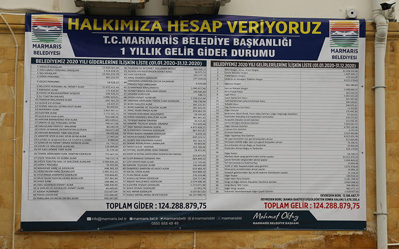Afişe göre Marmaris Belediyesi'nin 2020 yılı geliri 124.288.879,75 lira olurken, gideri ise 124.288.879,75 lira olarak gerçekleşti. Belediyenin 12.186.687,77 liralık devreden borcu bulunurken, banka bakiyesi düştükten sonra kalan borcun ise 5.678.330,4 olduğu belirtildi.