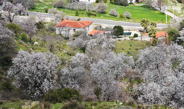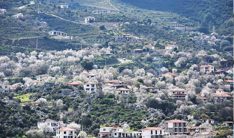 Badem ağaçlarının çiçek açmasını "baharın müjdecisi" olarak karşılayan mahalle sakinleri ve ilçedeki yabancı turistler beyaza bürünen ağaçlar ve papatyalarla kaplanan kırlarda fotoğraf çektirdi.