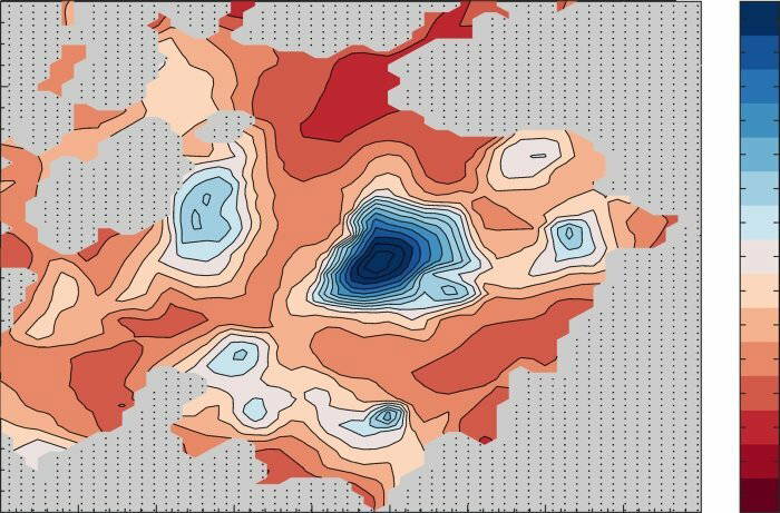 Radar verilerinin haritası. Yüksek oranda yansıtıcı olan mavi bölgeler, sıvı suya işaret ediyor. Lauro vd., Nature Astronomy, 2020